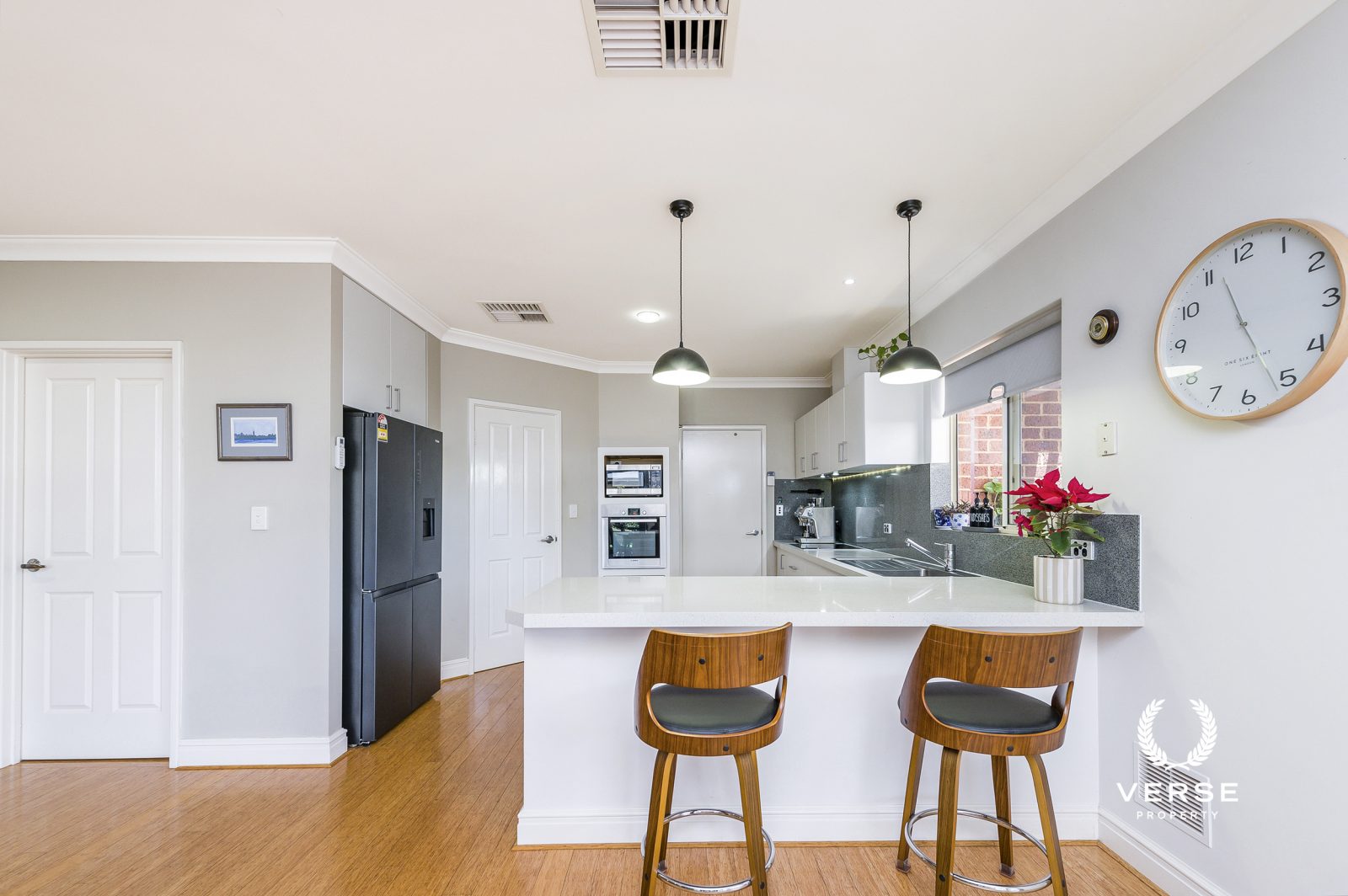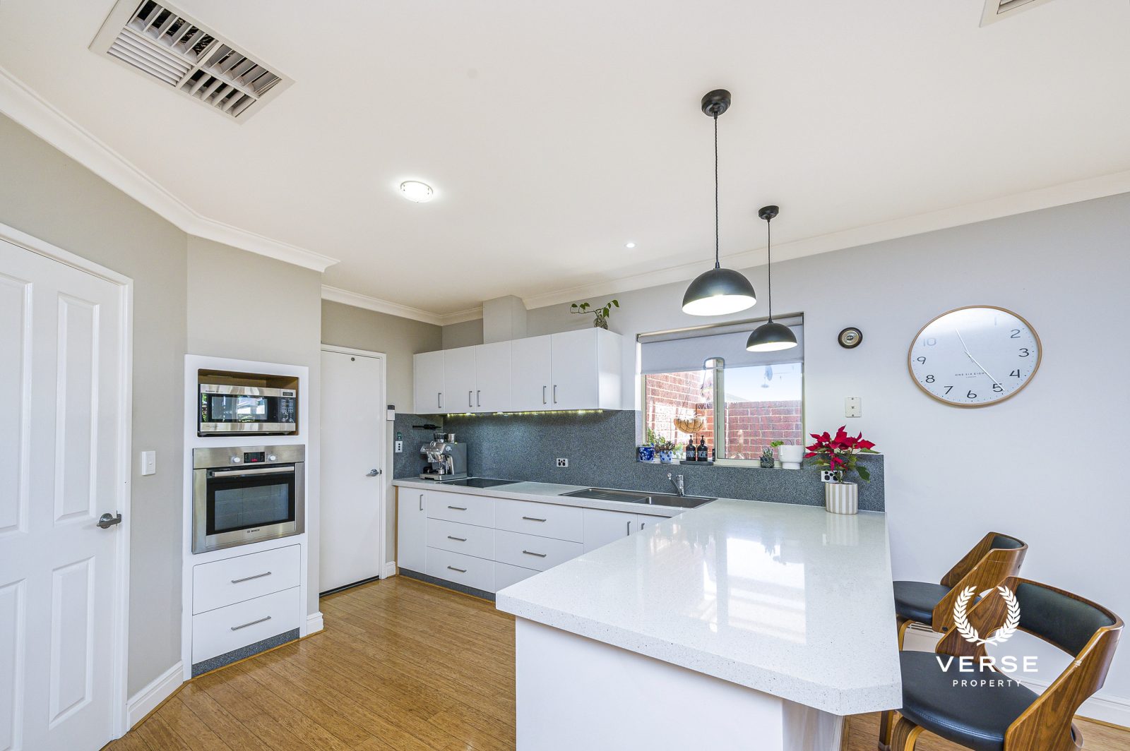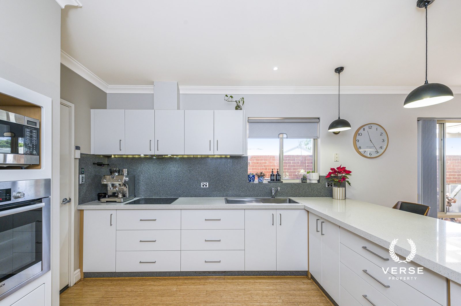 The centrepiece of the home is a contemporary, sunlit kitchen featuring Caesarstone Nougat benchtops and high-quality Bosch stainless-steel appliances, including a sleek oven and induction cooktop. A walk-in pantry and ample storage complete this sophisticated and functional space.