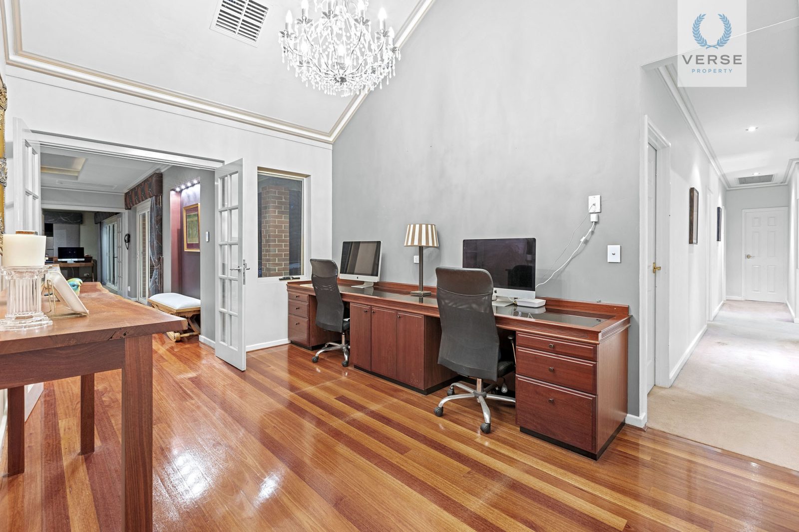 Upstairs comprises of five more bedrooms, including the luxurious master suite with ensuite, and large balcony overlooking the property. Additionally there is a large, rose gum timber floored, office with custom built jarrah and glass executive desks that can double as a 6th bedroom,