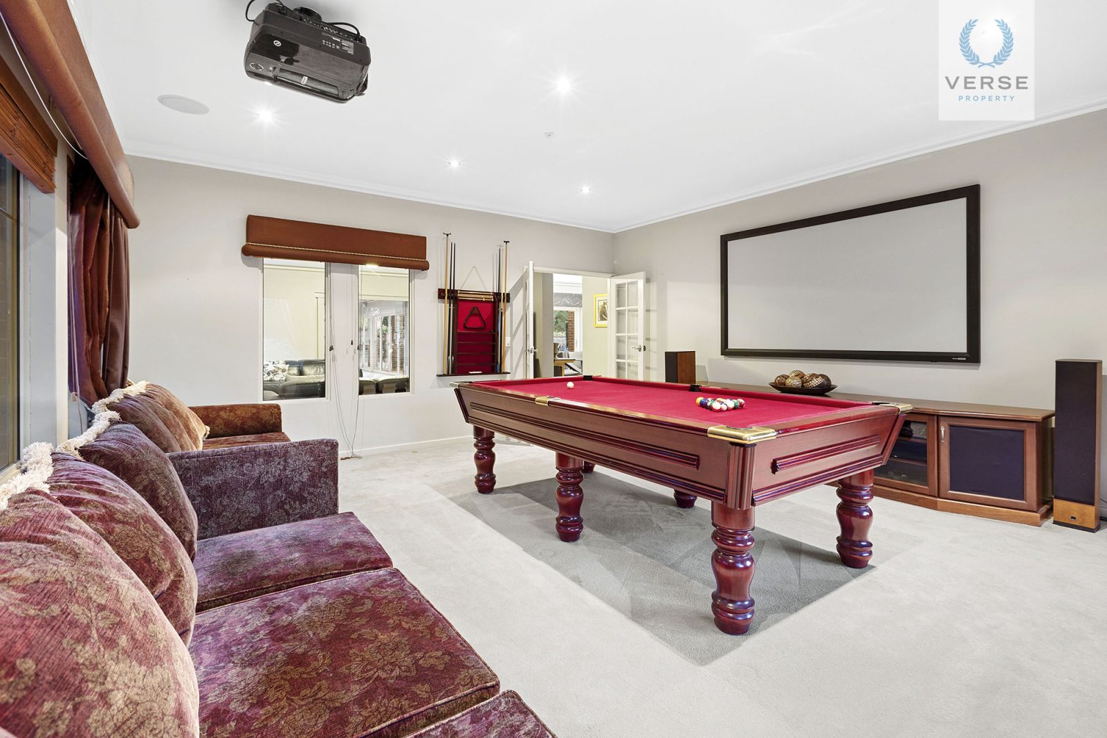 Leading through bi fold doors to the light filled kitchen and meals room. A well-appointed kitchen with granite tops and superior stainless steel appliances (Two full-sized ovens) with wonderful poolside view. A large family sitting room is the central hub of the home, adjacent is the home theatre equipped with projector TV screen and 8 ball pool table.