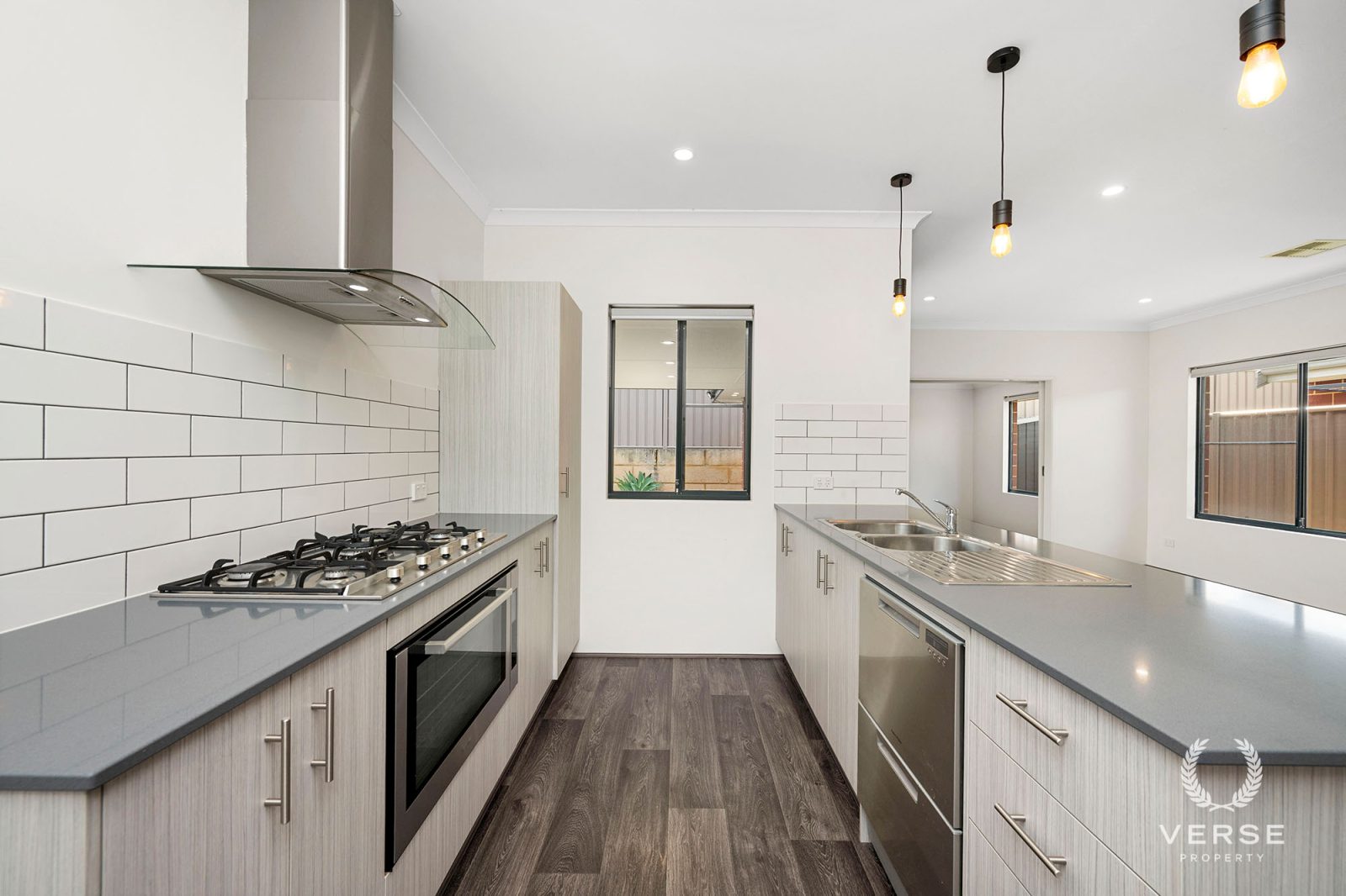At the centre of the home, on display is a modern and sleek kitchen. Refined with stone benchtops, a 1200mm oven, a gas cooktop, and a drawer dishwasher, a space designed with style, including feature pendant lighting, but not forgetting everyday ease, and entertaining without compromise.