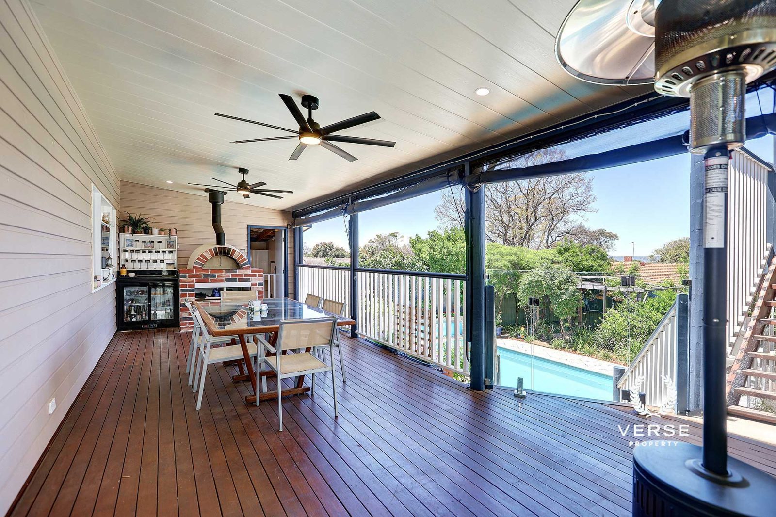 – Year round lounge/dining deck with Pizza oven, fully sheltered with weatherproof blinds,