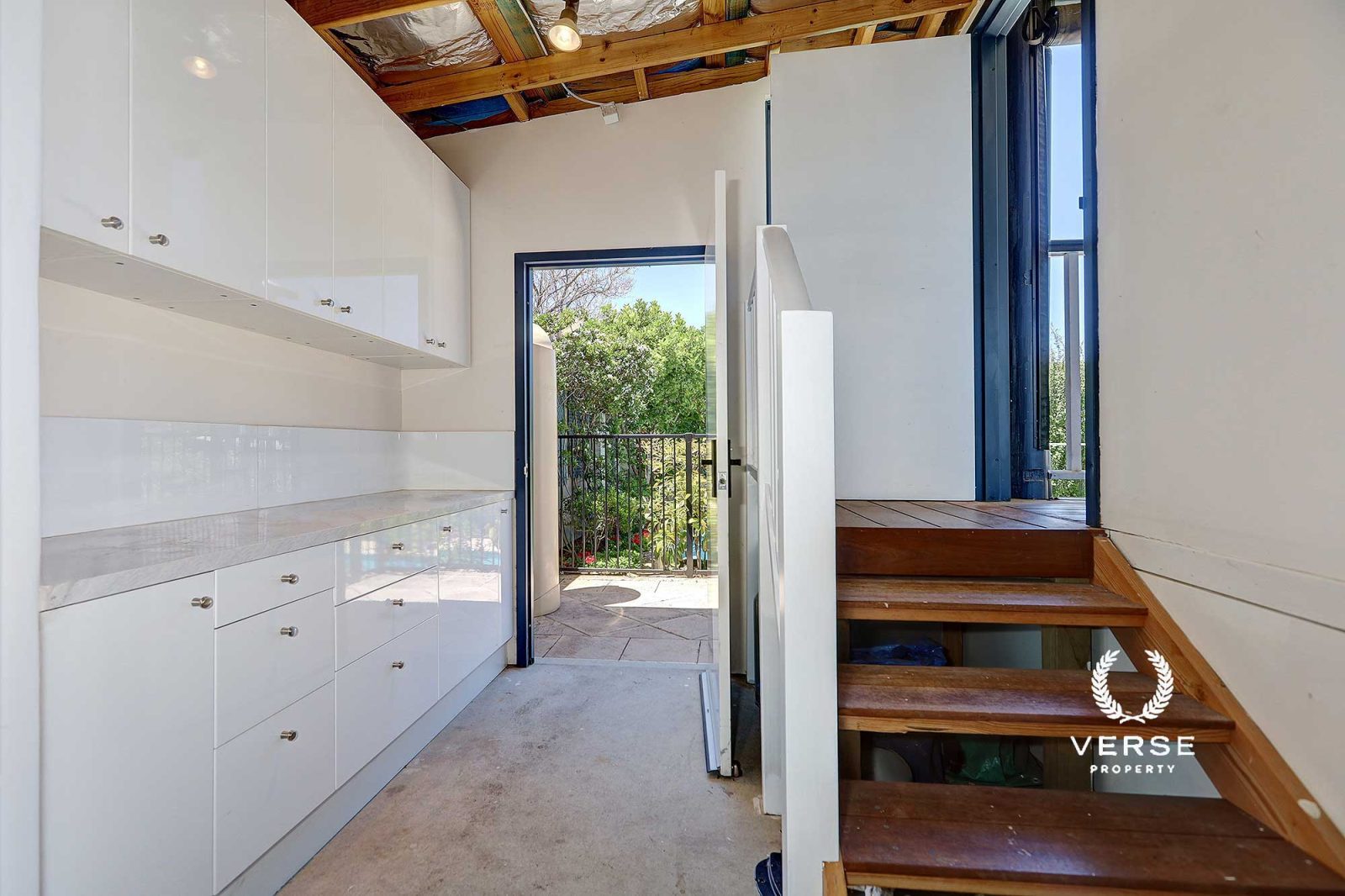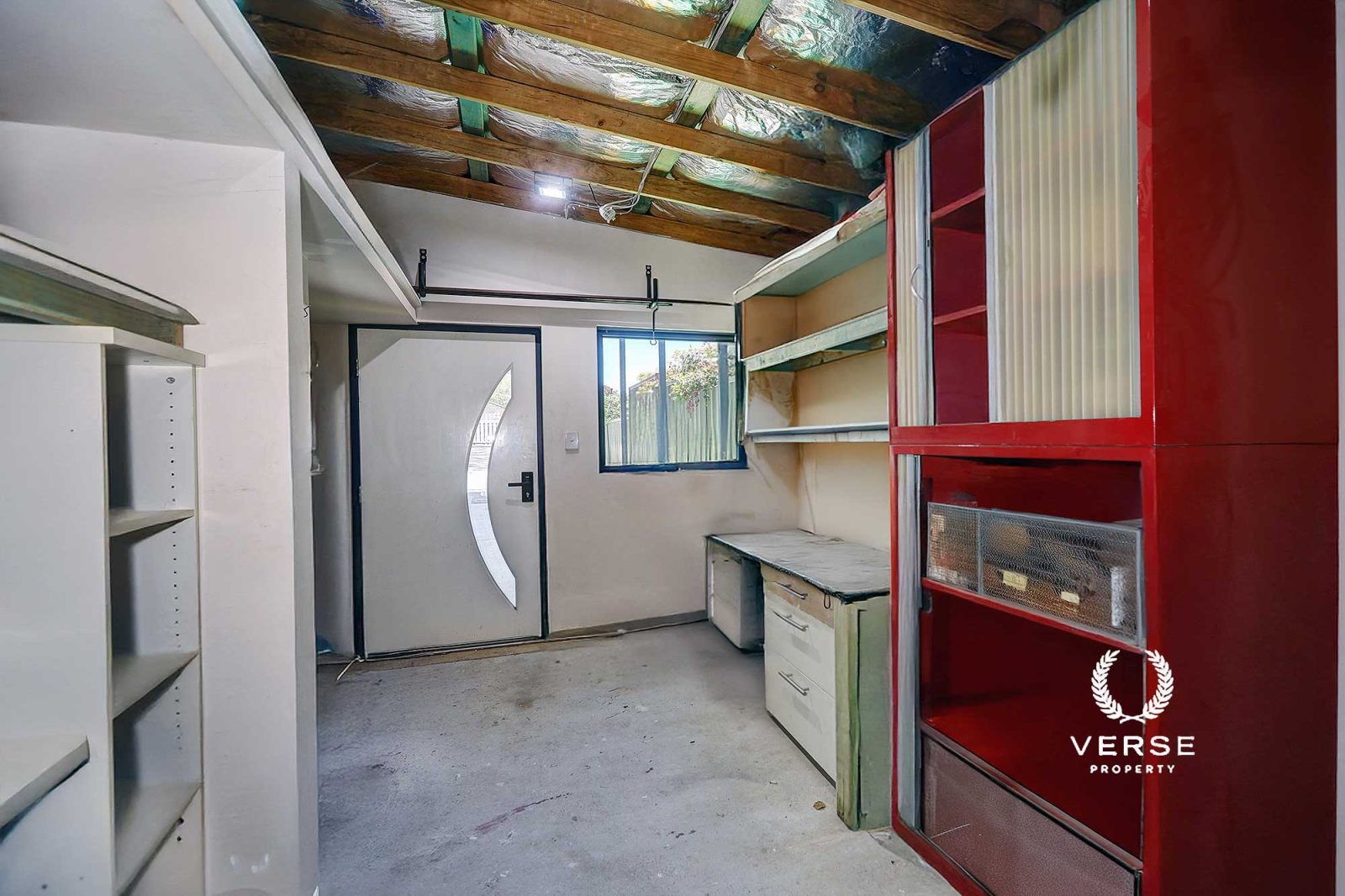 – Under roof workshop leading into a ‘below deck’ kitchenette + extra cabinet storage